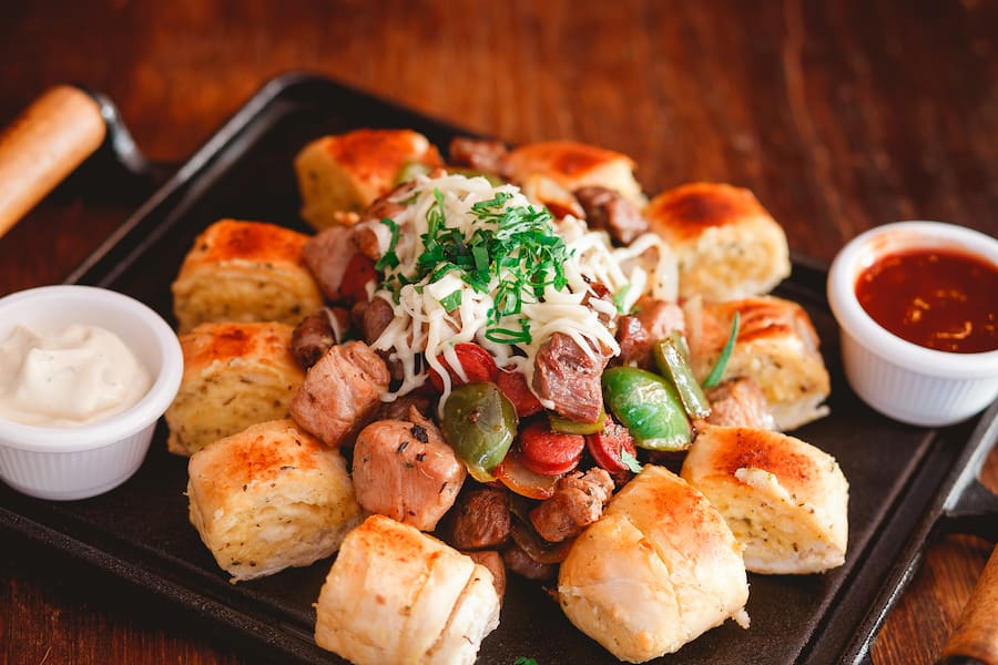 Nossa chapa Mais pedida. Iscas de Carne de Gado, Filé Mignon Suíno, Coração de Frango acompanhados de Calabresinha, Pimentão e Cebola em Cubos, 2 Pães de Alho assados, Queijo Mussarela e Tempero Verde.