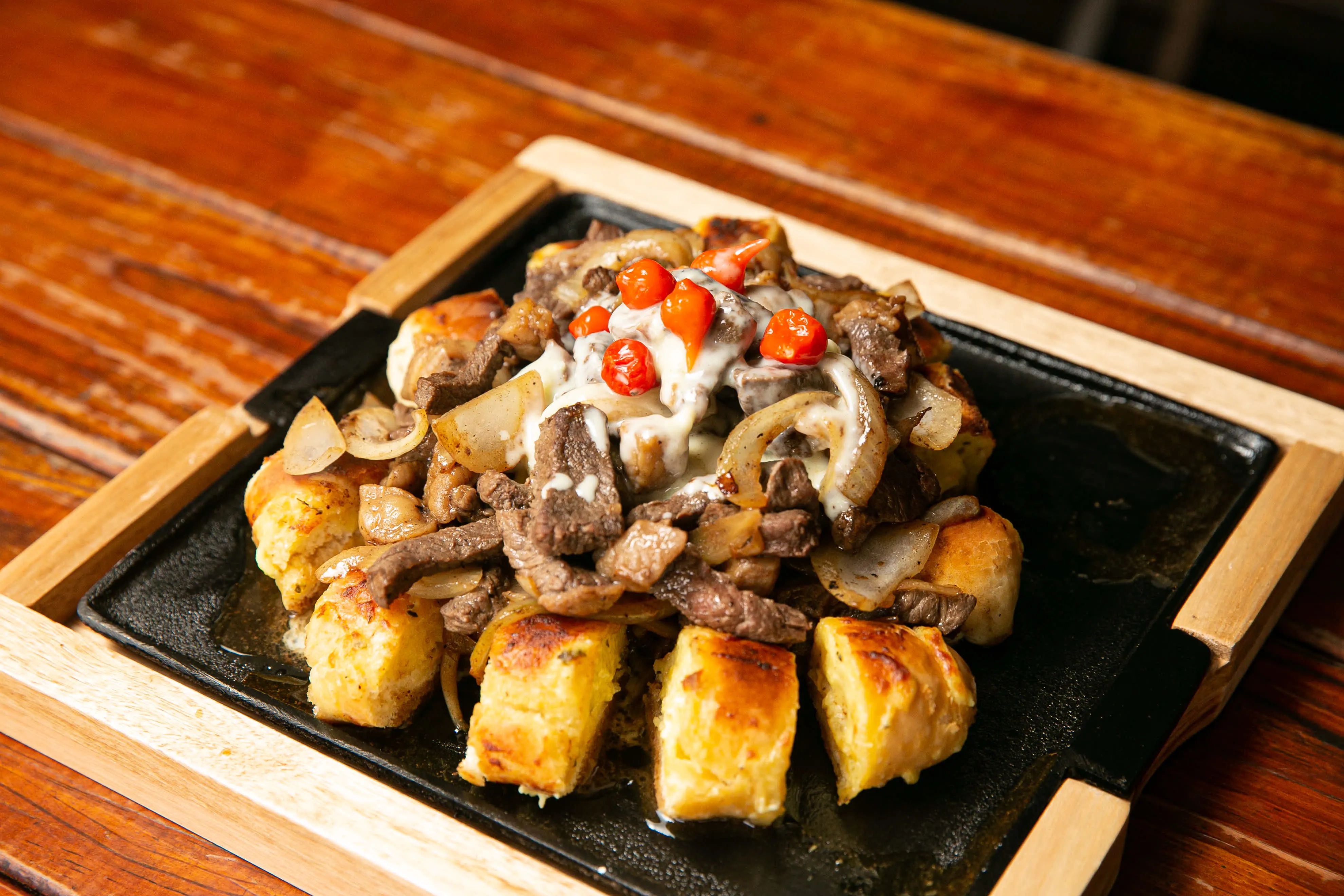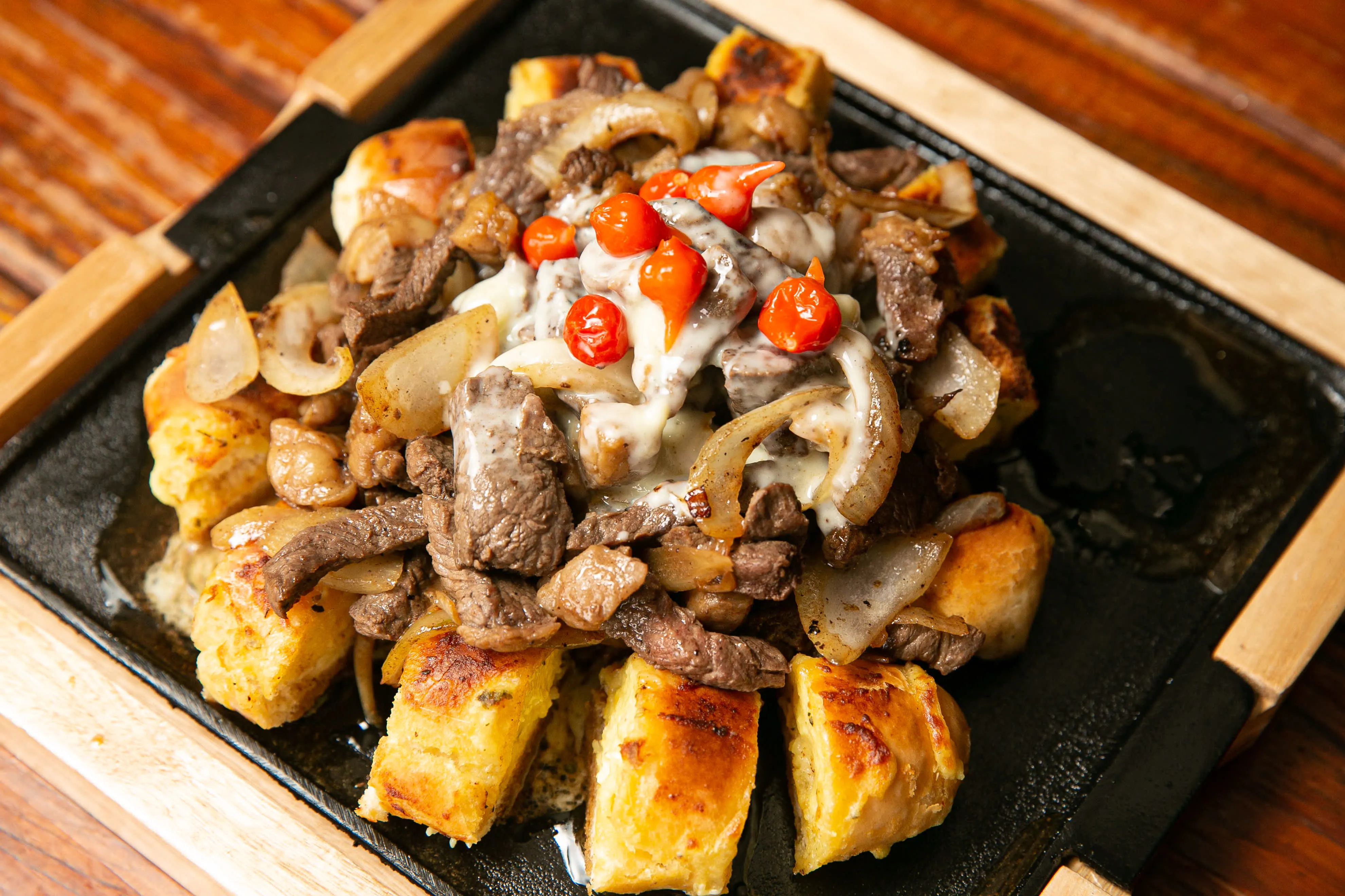 A mais saborosa. Iscas de Picanha feitas na Chapa (500g) com Cebola em Rodelas acompanhadas de 2 Pães de Alho Assados Molho de Queijo e Pimenta Biquinho