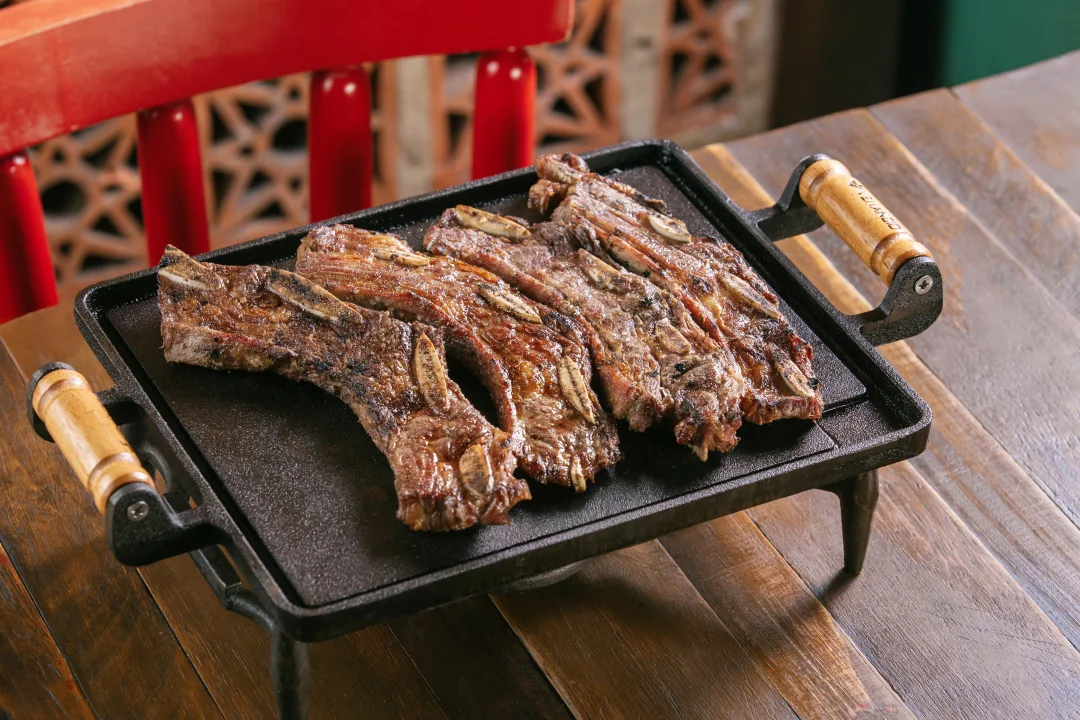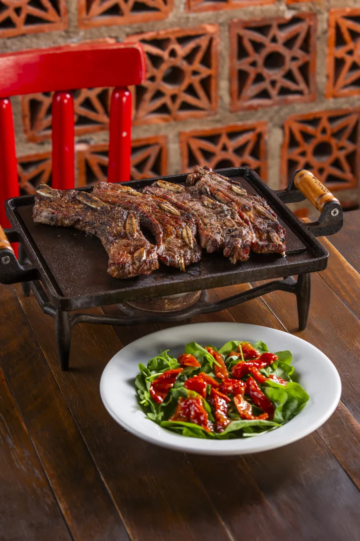 O clássico da gastronomia Argentina, o Assado em Tiras vem 500g de Costela Bovina e acompanha uma Salada de Rúcula com Tomate Seco.