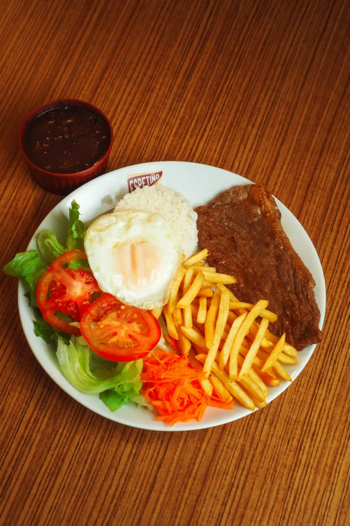 Bife Bovino (120g) feito na chapa acompanhados de Arroz, Feijão, Ovo Frito, Batata Frita e Mix de Salada.