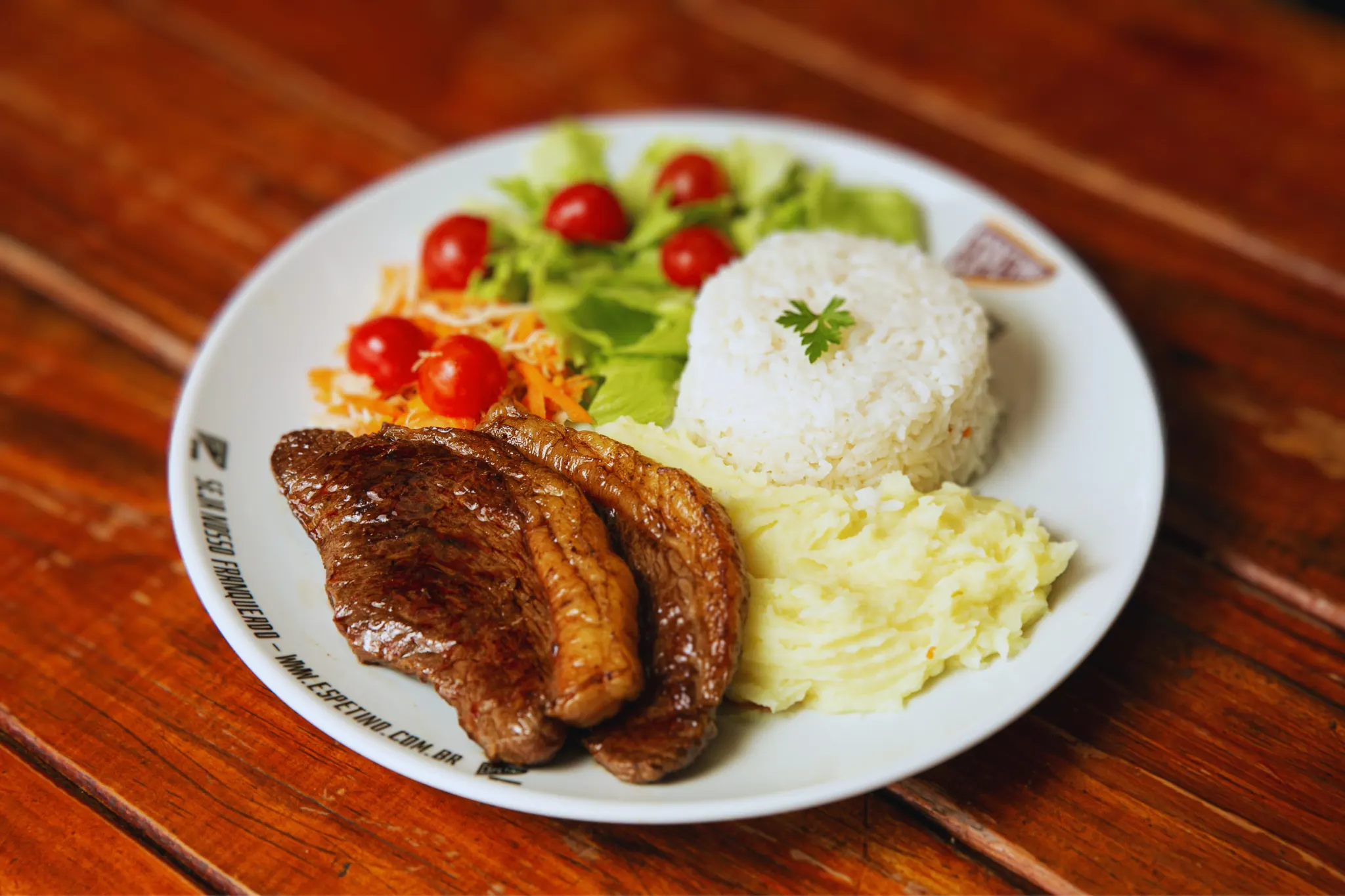 Bife Bovino (120g) feito na chapa acompanhados de Arroz, Feijão, Ovo Frito, Batata Frita e Mix de Salada.