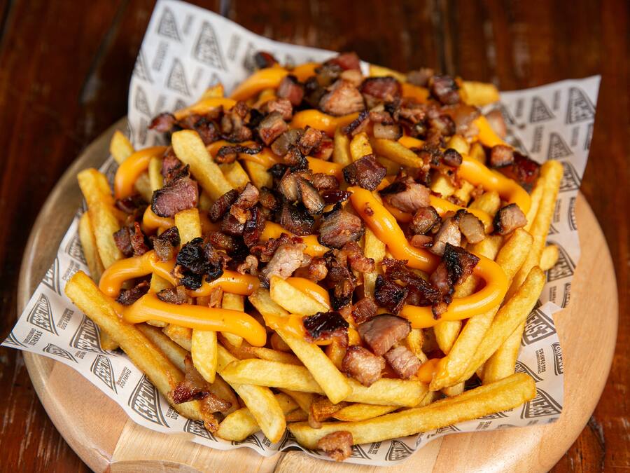 Tem opção melhor? Batata Frita com um delicioso Queijo Cheddar Cremoso e coberta de Iscas de Bacon Defumado