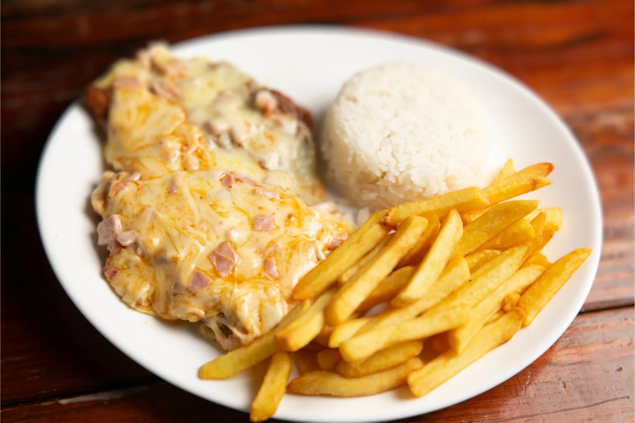 Bife Bovino (120g) feito na chapa acompanhados de Arroz, Feijão, Ovo Frito, Batata Frita e Mix de Salada.