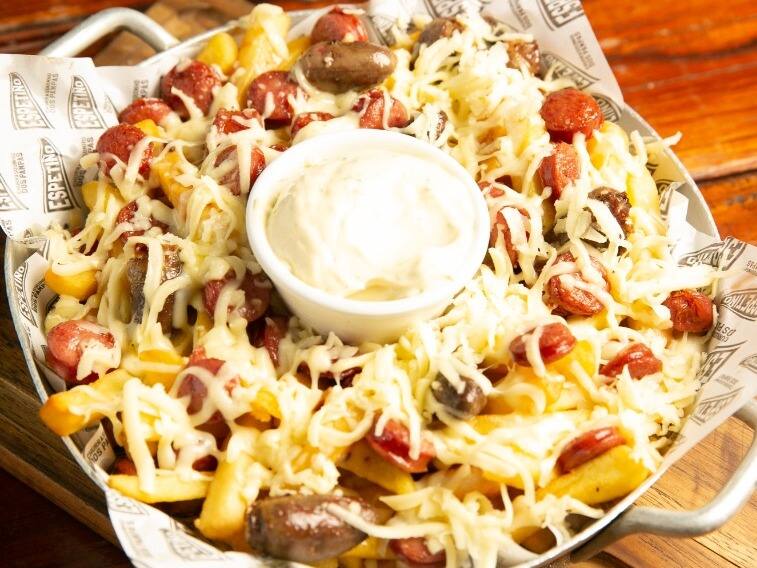 Batata Frita com Requeijão Cremoso, Coração e Calabresa feitos na chapa cobertos por Queijo Mussarela ralado. Essa é nossa Batata da Casa