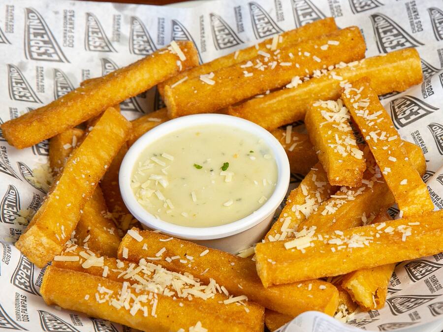 Crocante na medida certa. Polenta em palito Fritas cobertas com queijo Parmesão
