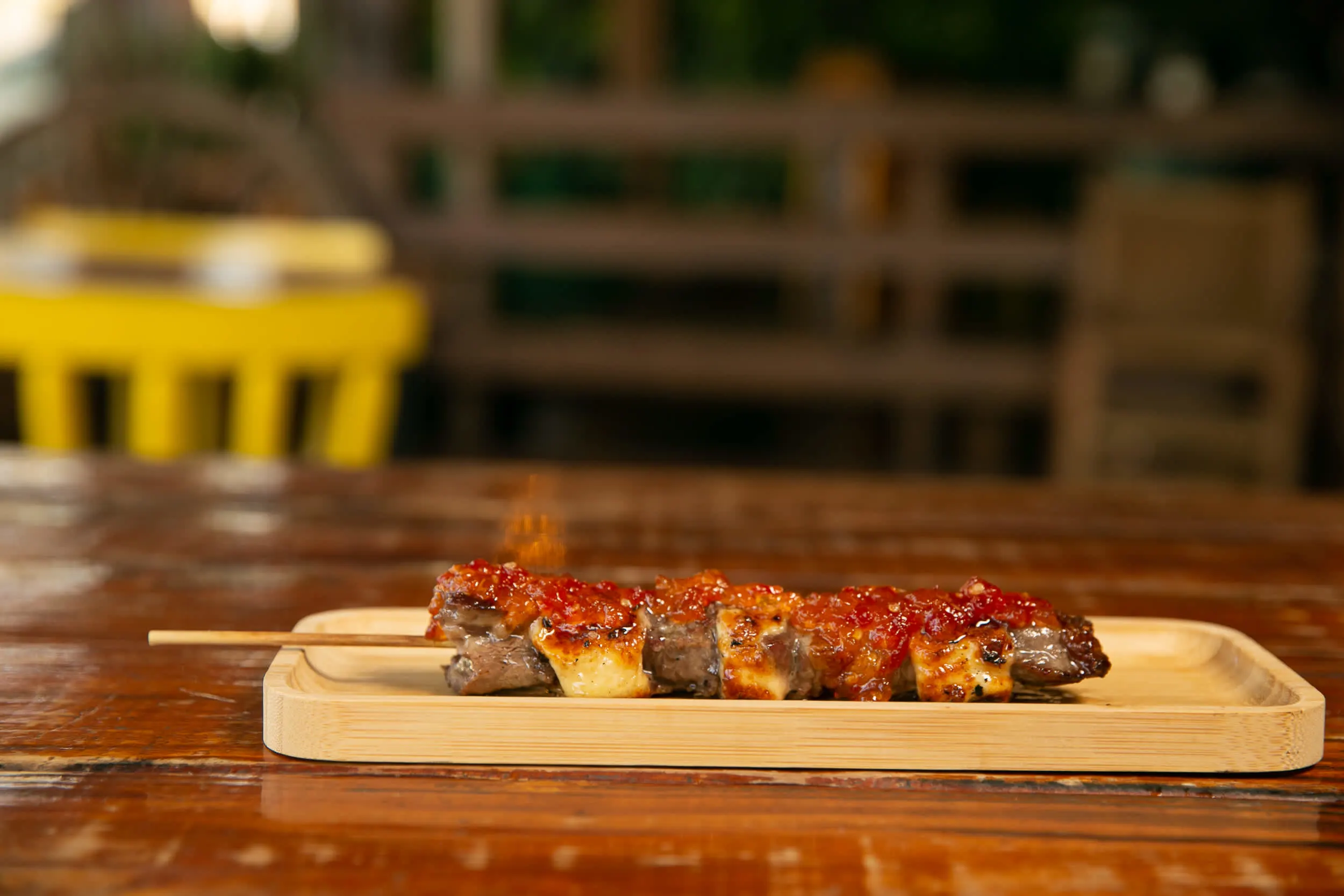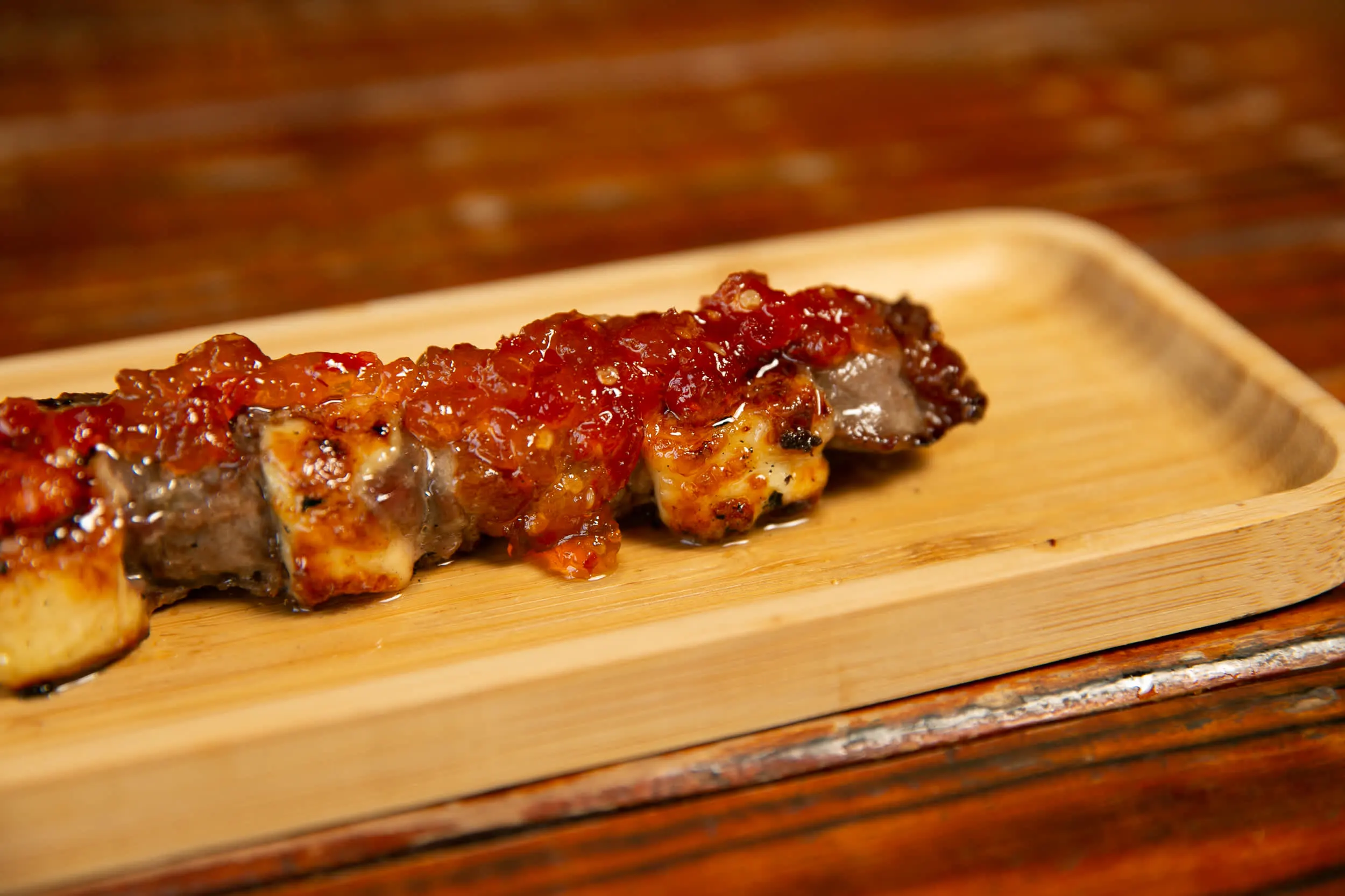 Um baita espetiño de Entrecot e Queijo Coalho com um toque especial de geléia de pimenta, que fica um sabor magnífico!