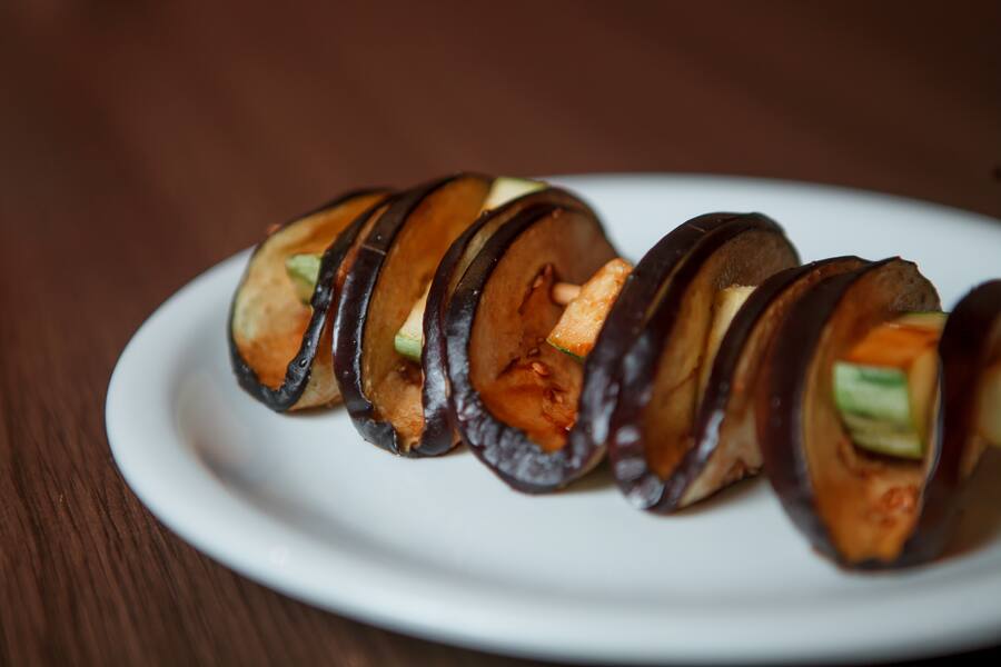 Aquela opção vegetariana para que todo mundo Adora! Fatias de Berinjela envoltas de Abobrinha Itália regadas em Molho Shoyo assadas na Brasa